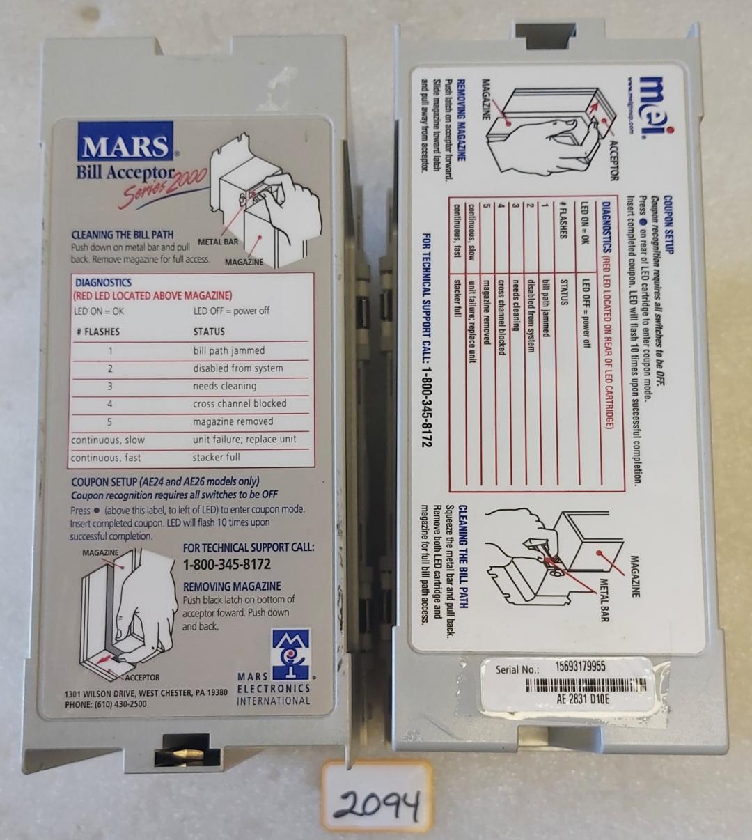 MARS MEI Series 2000 Bill Acceptor 1000 Bill Stacker Magazine (2094) - Lot of 2 - FREE SHIPPING
