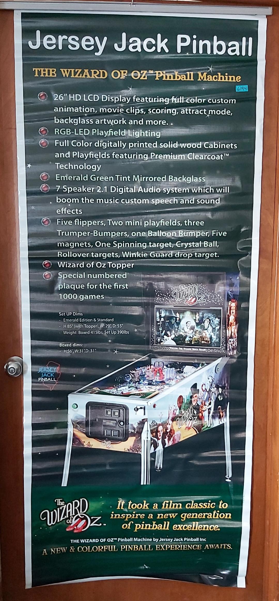 JERSEY JACK PINBALL WIZARD OF OZ Standard Collectible Vinyl Promotional Banner on Metal Hanger with Toggle Hook 30" x 63" - FREE SHIPPING