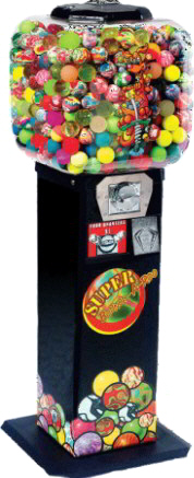 This machine can dispense large 45mm or 49 mm bouncy balls, 2″ toy capsules, or 2″ gumballs. Its super durable with bright, attractive graphics, dependable operation and a large capacity globe.
