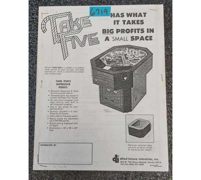 ALLIED TAKE FIVE Arcade Game MANUAL #6719.