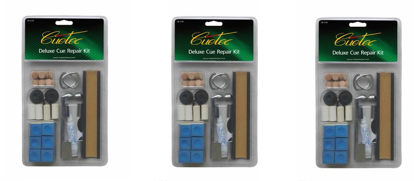 This is a Lot of 3 CUETEC Deluxe Pool Table Billiard Cue Stick Tip Accessory Repair/Maintenance Kits #9868 - Lot of 3 - New.Kit Includes:* (6) Chalk Cubes* (2) Metal Cue Clamps* (6) 12mm Leather Tips* (6) 13mm Leather Tips* (1) Sandpaper Holder* (1) Sandpaper Strip* (1) Cue Tip Cement (1/4 fl. oz.)* (4) Ferrules* (2) Bumpers* (2) Screws* (4) Table Spots