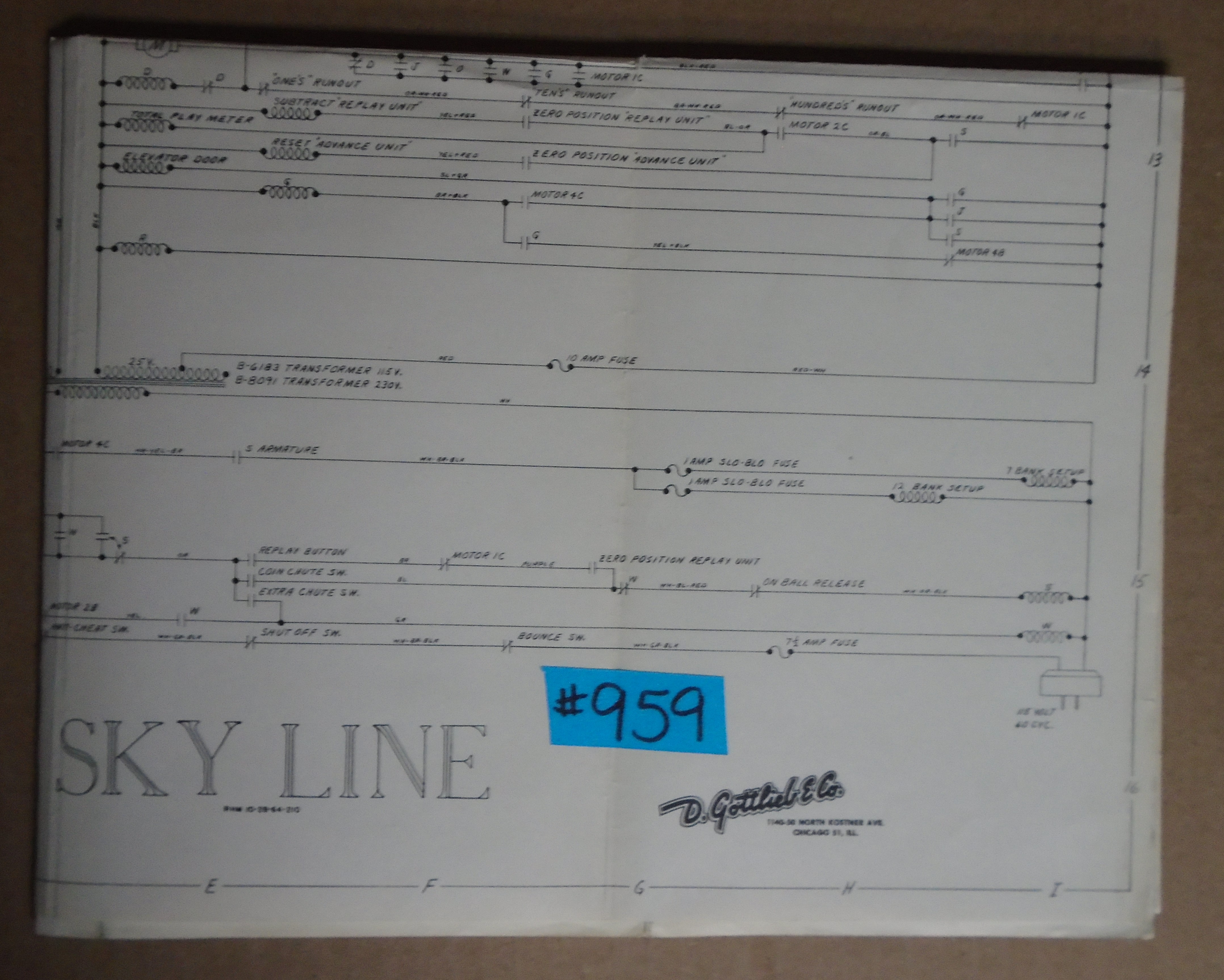 SKYLINE Pinball Machine Game SCHEMATIC #959 for sale by GOTTLIEB - FREE SHIPPING
