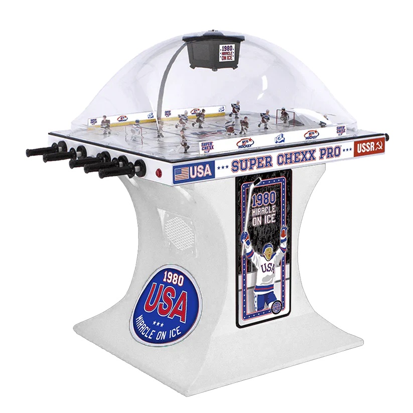 The Miracle on Ice™ Edition of the Super Chexx Pro is an official licensed USA Hockey product. It commemorates the historic Miracle on Ice game, featuring custom hand-painted USA vs. CCCP Jerseys, the national anthem, live action sounds and our 5" LCD Jumbotron with video scoreboard and animations.